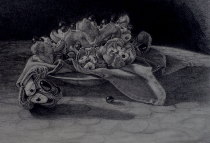 Pencil drawing of ackees on a silver platter. Afro-Caribbean traditional food