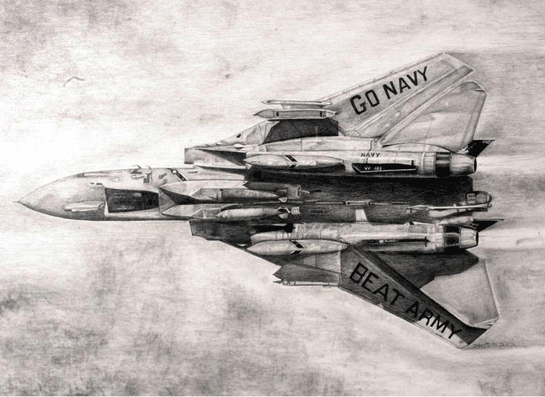 Pencil drawing of F-14 jet in flight.