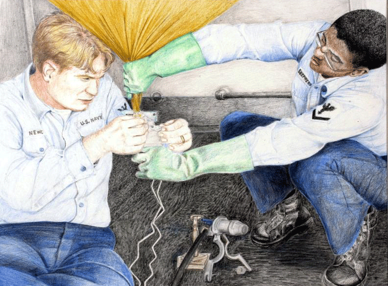 Color pencil drawing of Aerographers inflating a weather balloon aboard an aircraft carrier.